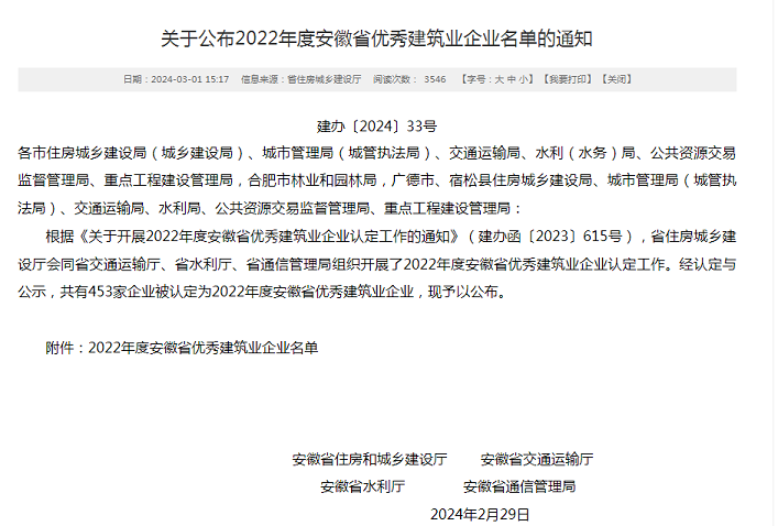 近日,安徽省住房和城乡建设厅发布了“2022年度安徽省优秀建筑业企业”名单,黄山建工集团凭借企业经营发展、管理创新能力、企业建造能力、企业文化建设、社会责任履行等方面的卓越表现再次名列榜单――建筑工程总承包类(特级、一级类别)省优秀建筑业企业,连续多年斩获该项殊荣。